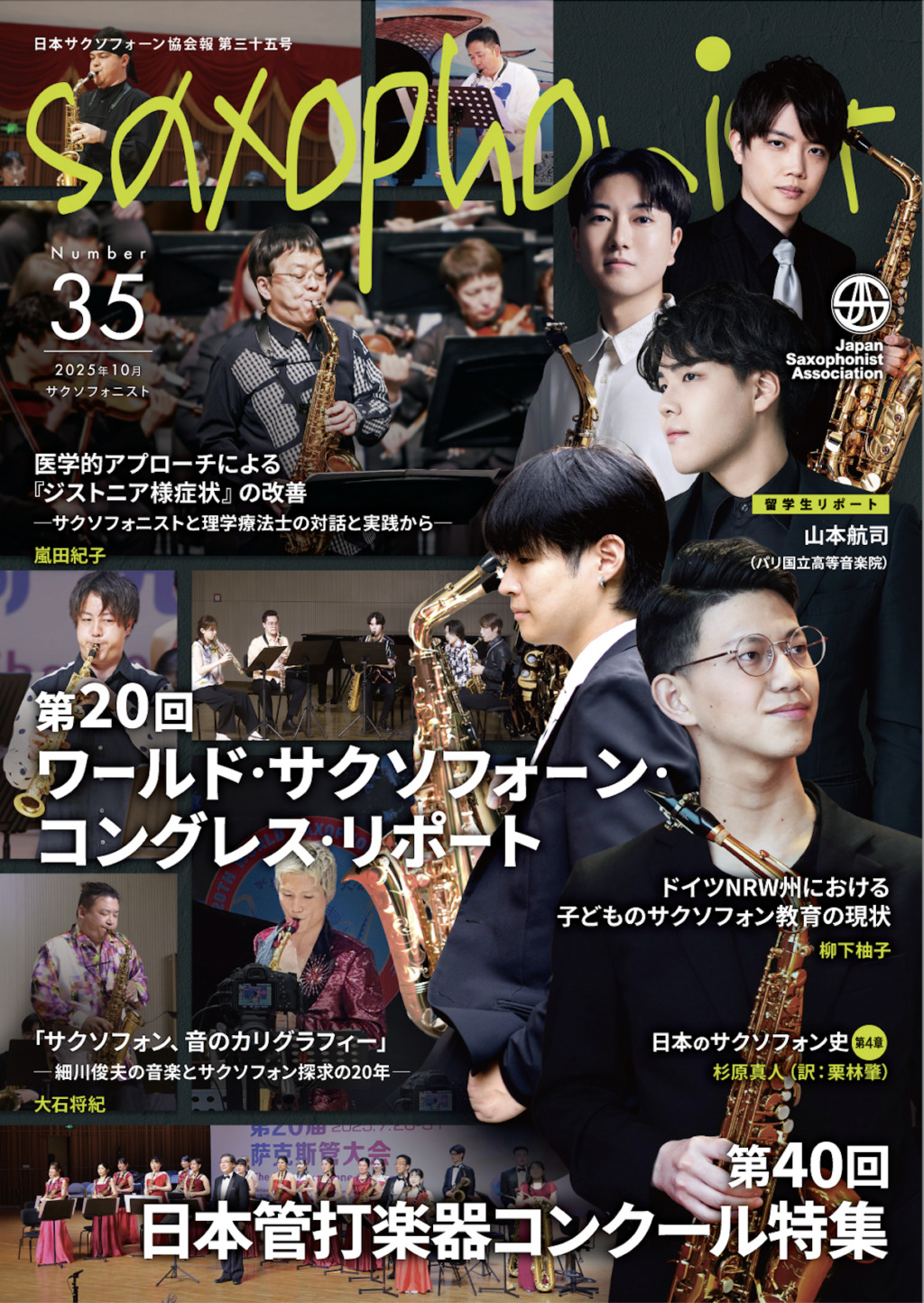 「サクソフォニスト」は、日本サクソフォーン協会の機関誌として協会設立の翌年1980年10月に第一号が発刊され、1985年9月発刊から研究紀要的要素をより濃くした各研究者達の研究論文が掲載される様になりました。