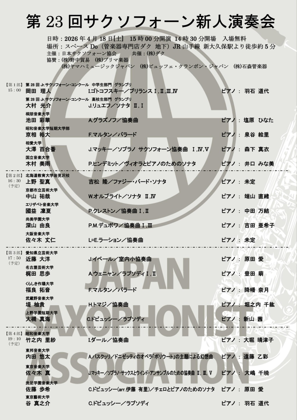 サクソフォーン音楽(クラシック)の向上発展に寄与する事を目的(協会会則第2条)に掲げ