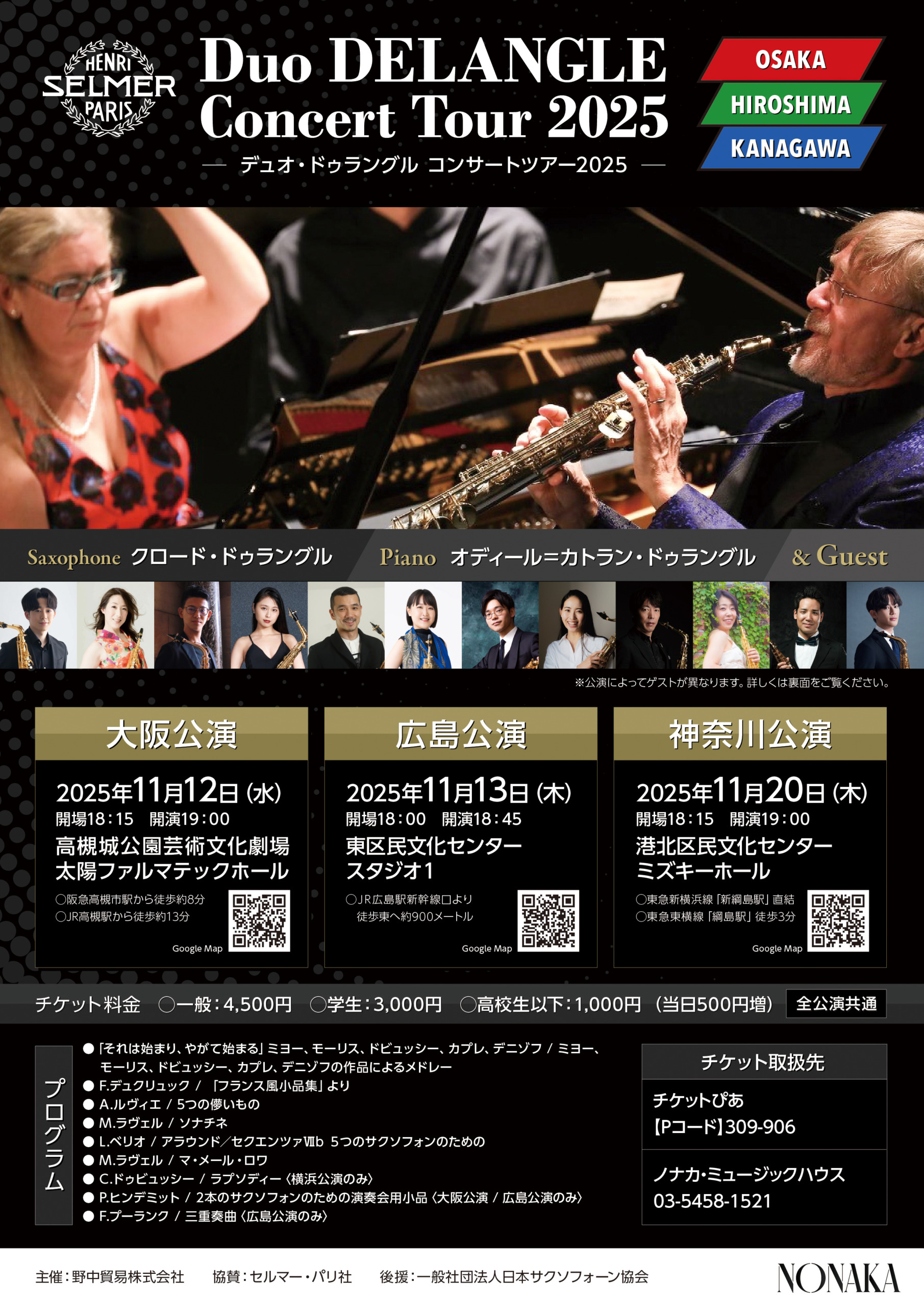 出演者 | 【出演者】 Saxophone クロード・ドゥラングル Piano オディール=カトラン・ドゥラングル Guest 大石将紀 |
