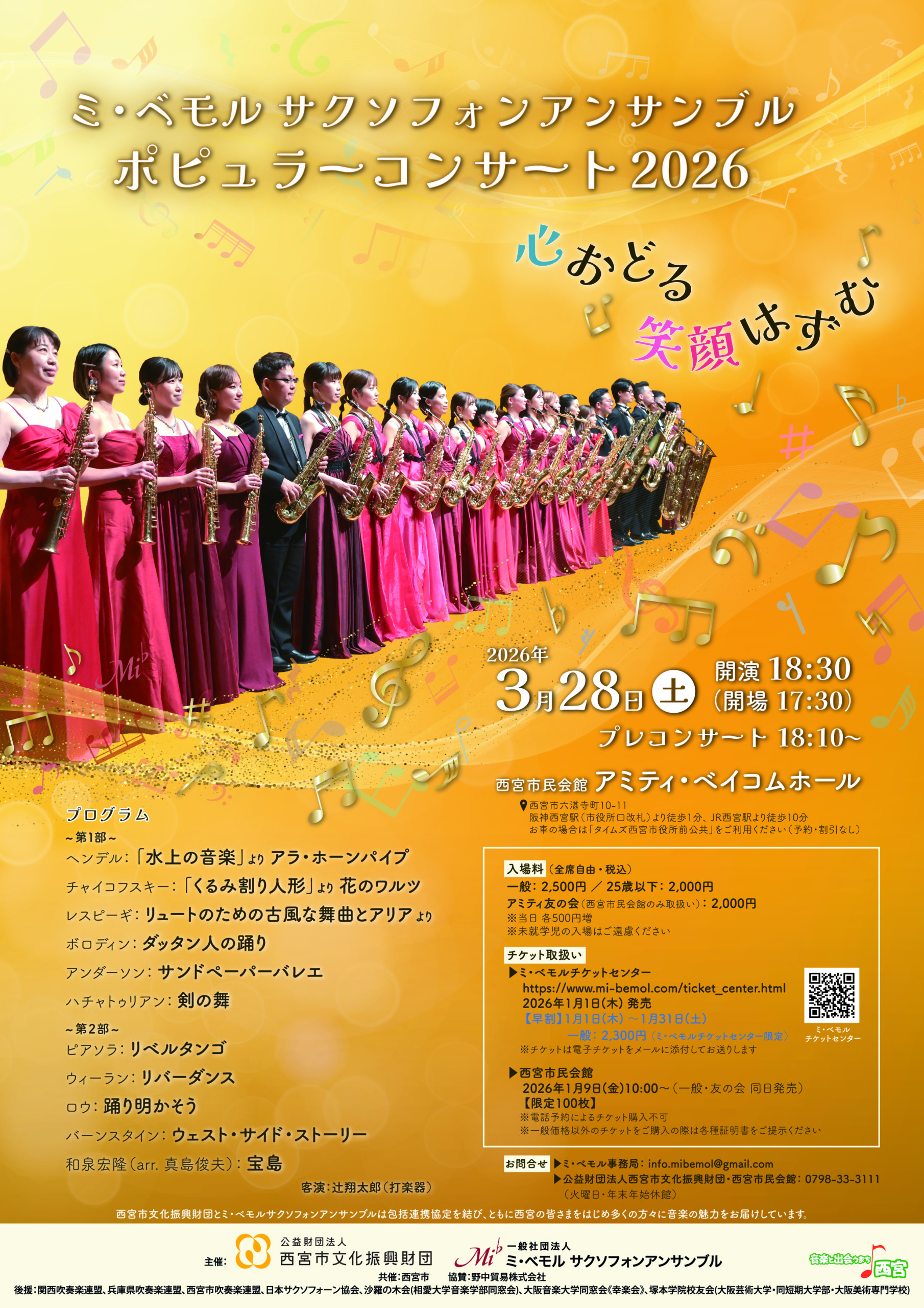 | 問い合わせ | ▶ミ・ベモル チケットセンター https://www.mi-bemol.com/ticket_center.html 2026年1月1日(木) 発売 ▶西宮市民会館 2026年1月9日(金)10:00~(一般・友の会同日発売) |