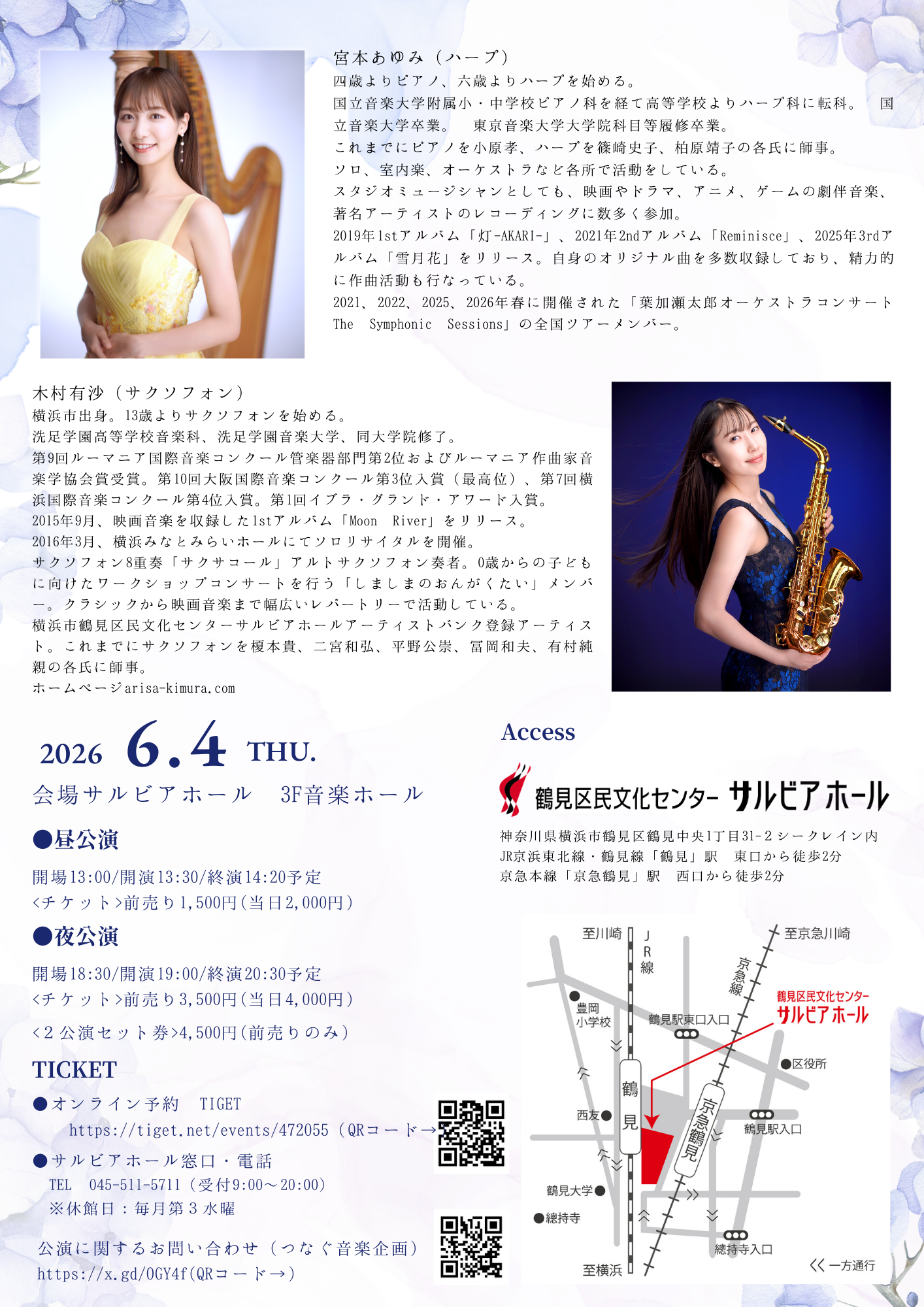 | 出演者 | 木村有沙(サクソフォン) 宮本あゆみ(ハープ) |
